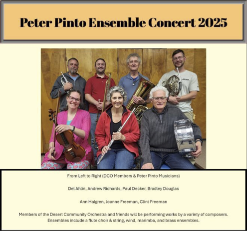 This concert serves as a fundraiser for the Peter Pinto Music Scholarship which is awarded annually to students (graduating high school senior to 22nd birthday) planning to continue their musical studies privately or in college. Applicants are evaluated on their musical performance, school and community involvement, and future musical goals. The award is named for the late Dr. Peter Pinto, a pediatrician, who played the violin for many years in the Desert Community Orchestra.